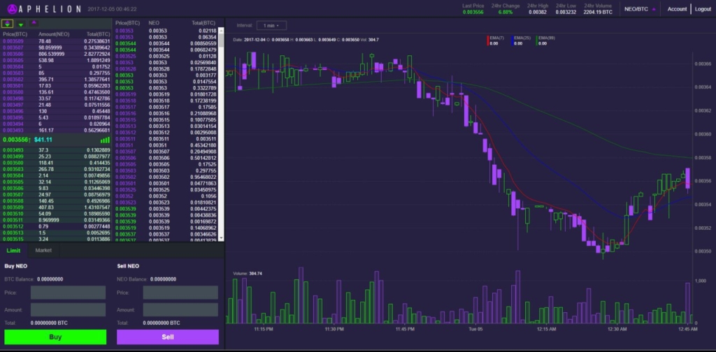 Der Aphelion-Token (APH) stützt sich auf der NEO-Blockchain und wird der zweite NEP-5 Token nach Ontology sein. Die Distributed-Ledger-Technologie von Aphelion setzt als Open-Source-Peer-to-Peer (P2P)-Anwendungsprotokoll (https://github.com/aphtoken/) auf der NEO-Blockchain auf und wurde entwickelt, um Benutzern eine völlig dezentralisierte Umgebung zum Handel von Kryptowährungen zur Verfügung zu stellen. Einen ersten Eindruck der DEX vermittelt der Screenshot einer Testversion:
