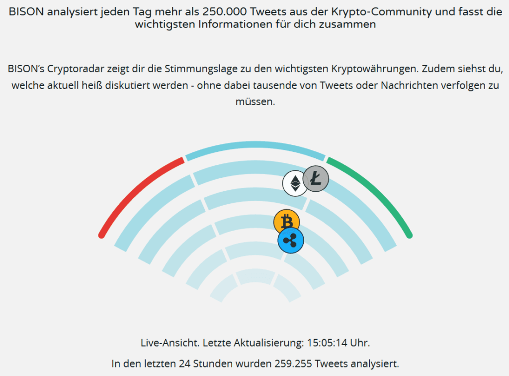 Eine weitere Funktionalität der App soll das „Cryptoradar“ sein, der jeden Tag mehr als 250.000 Tweets aus der Krypto-Community auf Basis von künstlicher Intelligenz (KI) analysieren und die wichtigsten Informationen zusammenfassen soll. Laut Bison App Webseite soll das Radar aufzeigen, welche Kryptowährungen gerade besonders intensiv diskutiert werden.