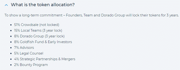 Die Gründer, das Team und das Unternehmen selbst müssen Ihre Token für drei Jahre halten. Dies stellt einen Vertrauensmechanismus des Teams dar, damit es zu keinem Dumping des Tokens kommen wird, wenn dieser auf gängigen Kryptomarktplätzen gehandelt wird. Bei anderen ICOs können ansonsten Tokens ohne Locktime sofort vom Team veräußert werden, was nach unser Einschätzung eher mit Skepsis zu werten ist und schnell den Eindruck erweckt, dass das Unternehmen nur auf das schnelle Geld hinaus ist.