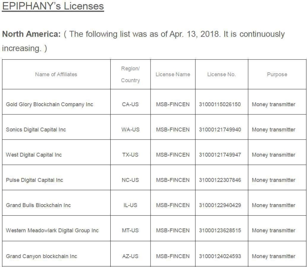 EPIPHANY besitzt bereits mehrere Bankenlizenzen und ermöglicht ab ca. August / September 2018 den dezentralen Handel von Kryptowährungen und dessen Transformation in konventionelles Fiat-Geld wie USD.