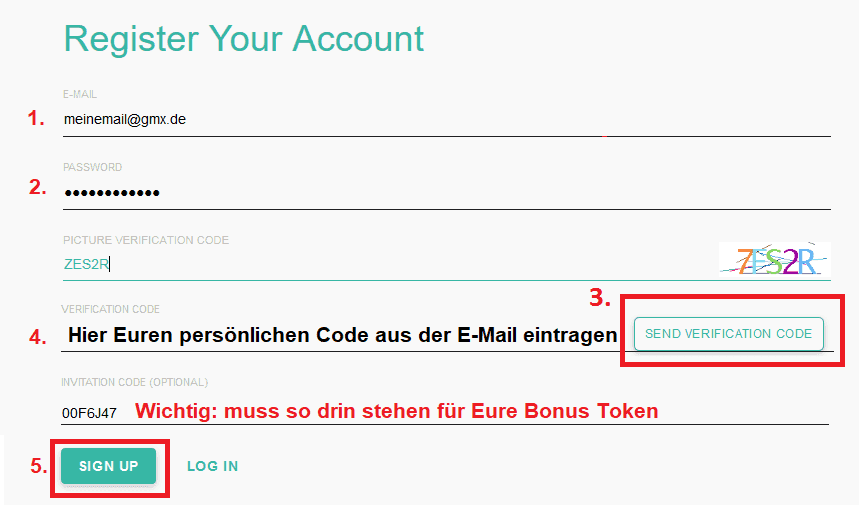 Drückt hierzu einfach auf den nachfolgenden Link und gibt Eure Mailadresse und ein sicheres Passwort ein, um den persönlichen Verification Code zu erhalten. Habt etwas Geduld, die Mail wird nach bis zu 15 Minuten zugestellt. Euren Verification Code trägt ihr (wie unten im Screenshoot als Punkt 4. ersichtlich) ein und den dargestellten Picture Verification Code.