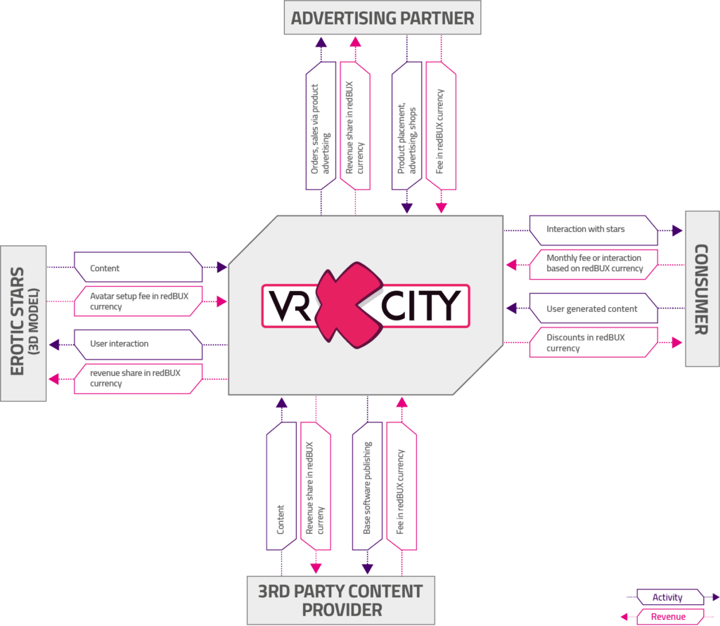 Nutzer der vrXcity können sich nicht nur den eigenen Wunsch nach sexueller Befriedigung erfüllen, sondern auch selbst zum Inhalteanbieter werden und mit der zugrunde liegenden Smart-Contract-Technologie der Blockchain Geld verdienen. Hierzu können in der virtuellen Welt auch Räume oder Gebäude erworben werden, oder selbst interaktive, erotische Inhalte erstellt werden, in welche sie andere Nutzer einladen können, um von ihnen persönlich erstellte erotische, interaktive Inhalte zu erleben und somit an andere Nutzer verkauft werden. Der Fantasie sind damit keine Grenzen gesetzt.