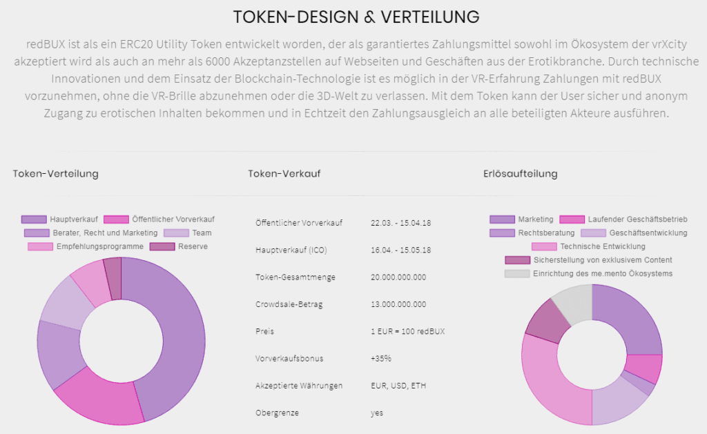 redBUX ist ein basierend auf dem ERC20 Standard basierender Dienste-Token „Utility-Token“ (siehe S. 22 im Whitepaper). Der redBUX Token kann zur Bezahlung für vrXcity–Inhalte sowie für Medien-Inhalte auf sechs weiteren großen Porno- und Erotik-Webseiten eingesetzt werden. Nachfolgend ein kurzer Überlbick über die aktuell bestätigten Partnerschaften, viele weitere werden nach Aussage der me.mento 3D manufacture GmbH noch zeitnah folgen.