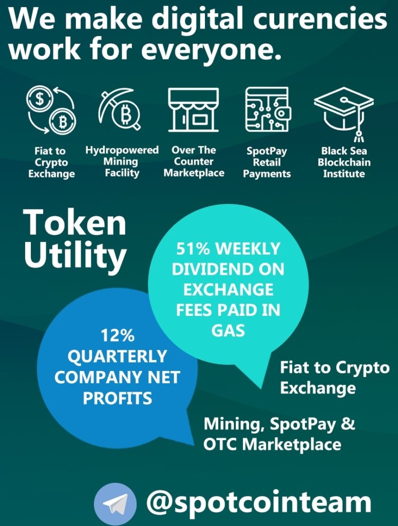 Spotcoin ist bereits Teil der Smart Economy und hat als Marktführer im Jahr 2017 über 10 Mio. USD im OTC-Handelsvolumen erreicht. Dieser Erfolg führte ermöglichte es dem Unternehmen von 3 auf 27 Mitarbeiter zu wachsen.  Spotcoin bedient institutionelle Investoren, Händler, Bergleute, Fach- und Einzelhändler.  Spotcoin beabsichtigt, das erste umfassende Digital-Asset-Ökosystem aufzubauen. Dieser Plan umfasst die Entwicklung der digitalen Spotcoin-Börse, des Zahlungssystems Spotpay, einer 25 MW-Mining-Anlage, die erneuerbare Energie nutzt und der Eröffnung des Black Sea Blockchain Institute.