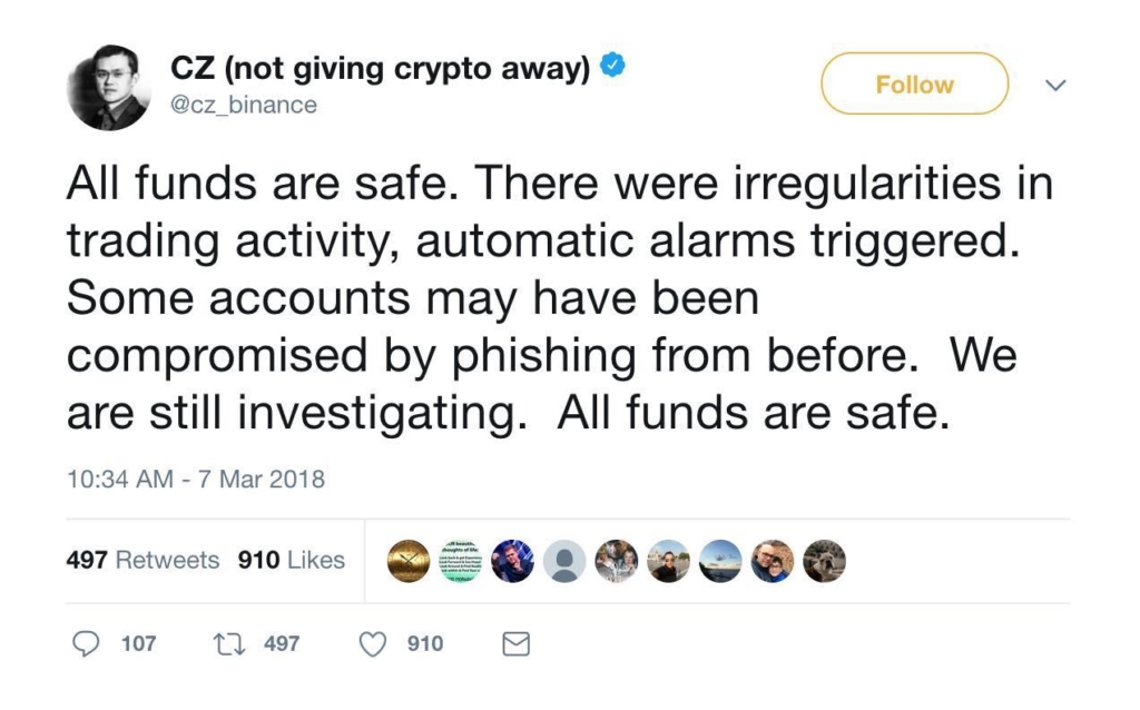 Kurze Zeit später hat der CEO von Binance „Changpeng Zhao“ per Twitter, dass alle Gelder auf den Konten sicher sind. Er führte aus, dass es Unregelmäßigkeiten in der beobachteten Handelsaktivitäten gab, vermutlich durch auf die Binance API-zugreifende Trading-Bots, die einen internen, automatischen Sicherheitsalarm ausgelöst haben, aber keine Kompromittierung der Benutzerkonten aufgetreten sei. Zhao versicherte, dass der Vorfall weiter aufgearbeitet wird. Die Zwei-Faktor-Authentifizierung soll durch den API-Zugriff angeblich auch aushebelbar gewesen sein.